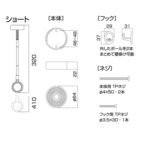 品 名 川口技研 ホスクリーン 室内物干 (天吊タイプ) SPDS-W 1本 カラー ポール:ホワイト 天井ベース:ホワイト 材 質 本体:亜鉛ダイカスト カバー:ポリアセタール樹脂 ポール:ステンレス ポール先端:亜鉛ダイカスト(クロームメッキ) リング:ナイロン フック:ABS樹脂 寸 法 320mm-410mm 特 徴 ●ショートサイズ 320-410mmの2段階調整可能です。