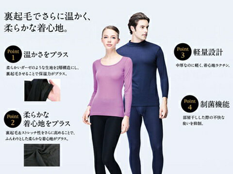ブレスサーモエブリの保温力に、やわらかい着心地をプラス! やわらかいガーゼのような生地を2枚重ねにし、裏起毛をさせ、さらにストレッチ性も向上したことで、従来品より保温力とやわらかい着心地のプラスに成功しました。
